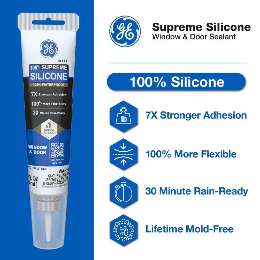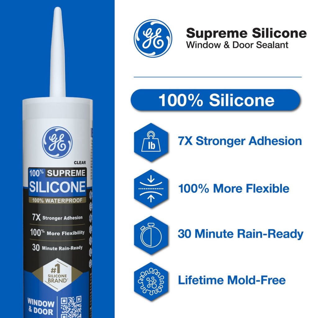 Image of GE Paintable Silicone Supreme sealant for windows, doors, and exteriors, waterproof and mold-free.