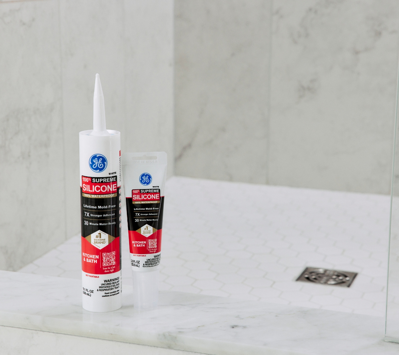 GE Supreme Silicone Kitchen & Bath Sealant sitting outside of a shower.