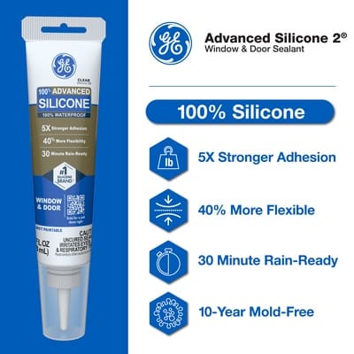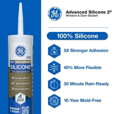 Advanced Silicone 2 Window & Door sealant is a high-performance, 100% silicone and 100% weatherproof sealant formulated to protect areas susceptible to harsh weather. These areas include windows, doors, siding, trim, molding, baseboards, vents, basements, attics and around wires and pipes. Its 30-minute rain-ready formula offers 40% more flexibility than Class 25 sealants and is 5X stronger than Silicone 1® sealant. In addition, it has 10-year mold-free product protection to help resist mold and mildew growth. Backed by a lifetime guarantee.